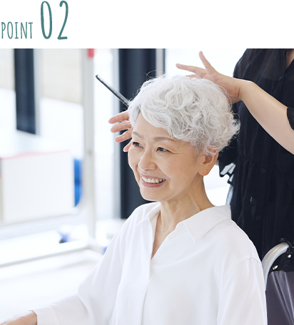 慣れたご自宅や施設で安心して過ごしていただけるよう、声かけや気配りを大切にしながらヘアカットや着付けを進めています。